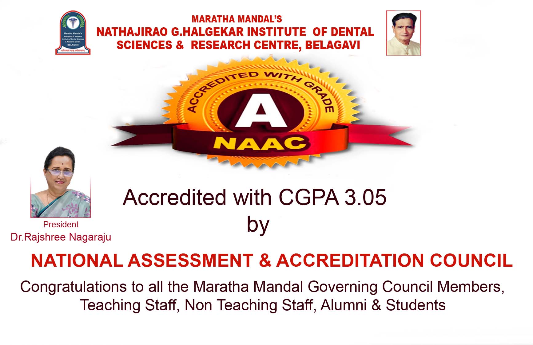 The Maratha Mandal Trust is ably managed by a board constituting the President, Vice President & Managing Committee Members, Trust Board Members & Governing Council Members, each a responsible and knowledgeable person with an immaculate track record. The success of Maratha Mandal can be attributed to their sterling contribution over the years. Nathajirao G. Halgekar Institute of Dental Sciences & Research Centre, Belgaum stands testimony to the high professional standards aimed for and achieved by The Maratha Mandal, Belgaum.